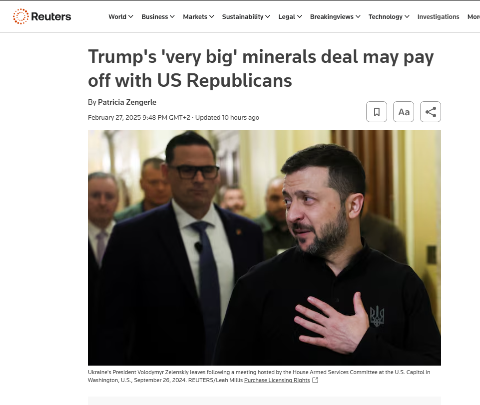 Η πολυαναμενόμενη συμφωνία για τα κρίσιμα ορυκτά που έχει διαπραγματευτεί ο Ντόναλντ Τραμπ με την Ουκρανία θα μπορούσε να μειώσει τις εντάσεις μεταξύ του Κιέβου και του Αμερικανού προέδρου, ενώ παράλληλα να βοηθήσει στην ανάκτηση της υποστήριξης των Ρεπουμπλικανών στο Κογκρέσο για έναν νέο γύρο βοήθειας προς τη δοκιμαζόμενη από τον τριετή πόλεμο με τη Ρωσία χώρα. Ταυτόχρονα θα είναι μια νίκη γοήτρου για τον Τραμπ που θα την παρουσιάσει ως έναν τρόπο να ανακτηθούν τα αμερικανικά χρήματα που έχουν δαπανηθεί για τη στήριξη της Ουκρανίας, όπως αναφέρει το Reuters.