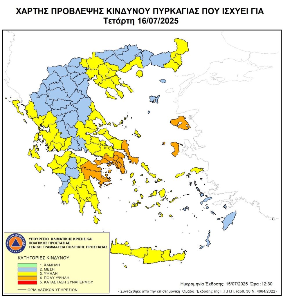 Οι υψηλές θερμοκρασίες και οι συνθήκες ξηρασίας που συνεχίζουν να ταλαιπωρούν τη χώρα αυξάνουν τον κίνδυνο για την εκδήλωση πυρκαγιών την Τετάρτη στις εξής περιοχές: