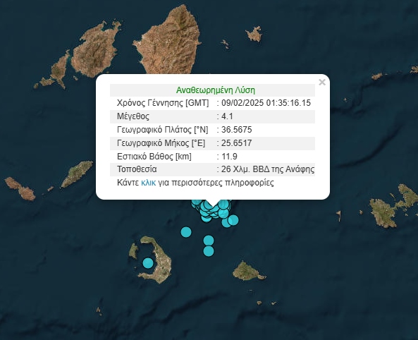 - 1. Η σεισμική ακολουθία στη θαλάσσια περιοχή της Ανύδρου μεταξύ Θήρας και Αμοργού παραμένει σταθερή, με περισσότερους από 800 σεισμούς από την 1η Φεβρουαρίου έως σήμερα με μέγεθος άνω του 3.0 (και με μέγιστο καταγεγραμμένο μέγεθος Μ 5.2).