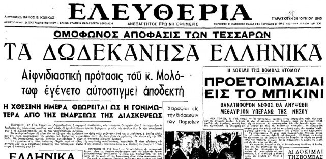 Μετά την λήξη του Β’ Παγκοσμίου Πολέμου λοιπόν, ήταν η χρυσή ευκαιρία για την ενσωμάτωση των Δωδεκανήσων στο ελληνικό κράτος, την οποία η ελληνική διπλωματία δεν έπρεπε να αφήσει να πάει χαμένη. Ήταν απαίτηση του ελληνικού λαού και είχε χυθεί άφθονο ελληνικό αίμα για την εκδίωξη των Γερμανών από τα Δωδεκάνησα.