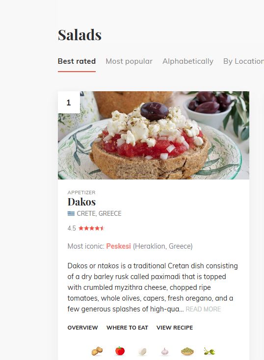 Ο γαστρονομικός οδηγός έδωσε βαθμολογία 4,5 αστεριών στον ντάκο, κατατάσσοντάς το πιάτο στην πρώτη θέση της λίστας. Ακολουθεί σαλάτα με κομμένο αγγούρι από το Θιβέτ και στην τρίτη θέση βρίσκεται η χωριάτικη σαλάτα, με 4,4 αστέρια.