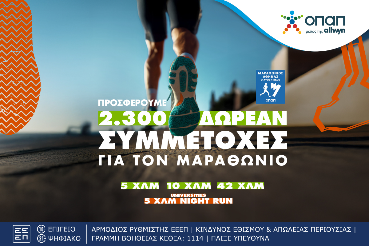 Τελευταία ευκαιρία για όσους θέλουν να τρέξουν στον Αυθεντικό Μαραθώνιο της Αθήνας – Ο ΟΠΑΠ προσφέρει 2.300 δωρεάν συμμετοχές στα 5, 10, 42 χλμ. ή 5 τα χλμ. Universities Night Run