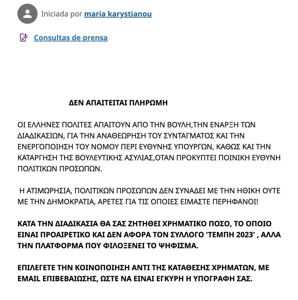 Η συλλογή υπογραφών αφορά την κατάργηση της βουλευτικής ασυλίας και την ενεργοποίηση του Νόμου περί Ευθύνης Υπουργών. Ωστόσο, η ασυλία δεν εμποδίζει την απόδοση δικαιοσύνης στα Τέμπη, ενώ οι αλλαγές που ζητούνται δεν εμπίπτουν στη νομοθετική πρωτοβουλία πολιτών καθώς αφορούν αναθεώρηση του Συντάγματος. Τέλος, τέτοιες αλλαγές δεν έχουν αναδρομική ισχύ, άρα δεν αφορούν την υπόθεση των Τεμπών».