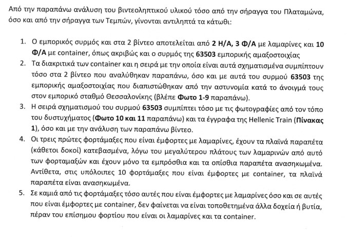 Συγκεκριμένα στην σελίδα 29 αναφέρουν: «Από την παραπάνω ανάλυση του δοθέντος βιντεοληπτικού υλικού, προκύπτει ότι σε αυτό εμφανίζεται η διερχόμενη εμπορική αμαξοστοιχία 63503 που συμμετείχε στο δυστύχημα της 28-2-2023, στο σύνολο της σύνθεσής της και κατά το χρόνο διέλευσής της, έμφορτη μόνο με όσα αναγράφονται στην επίσημη λίστα φορτίου, χωρίς να διακρίνεται οποιοδήποτε άλλο φορτίο επί των φορταμαξών. Η παρούσα έκθεση αφορά την ταυτοποίηση του εικονιζόμενου συρμού με την εμπορική αμαξοστοιχία 63503 χωρίς να πιστοποιεί τη γνησιότητα του βιντεοληπτικού υλικού».