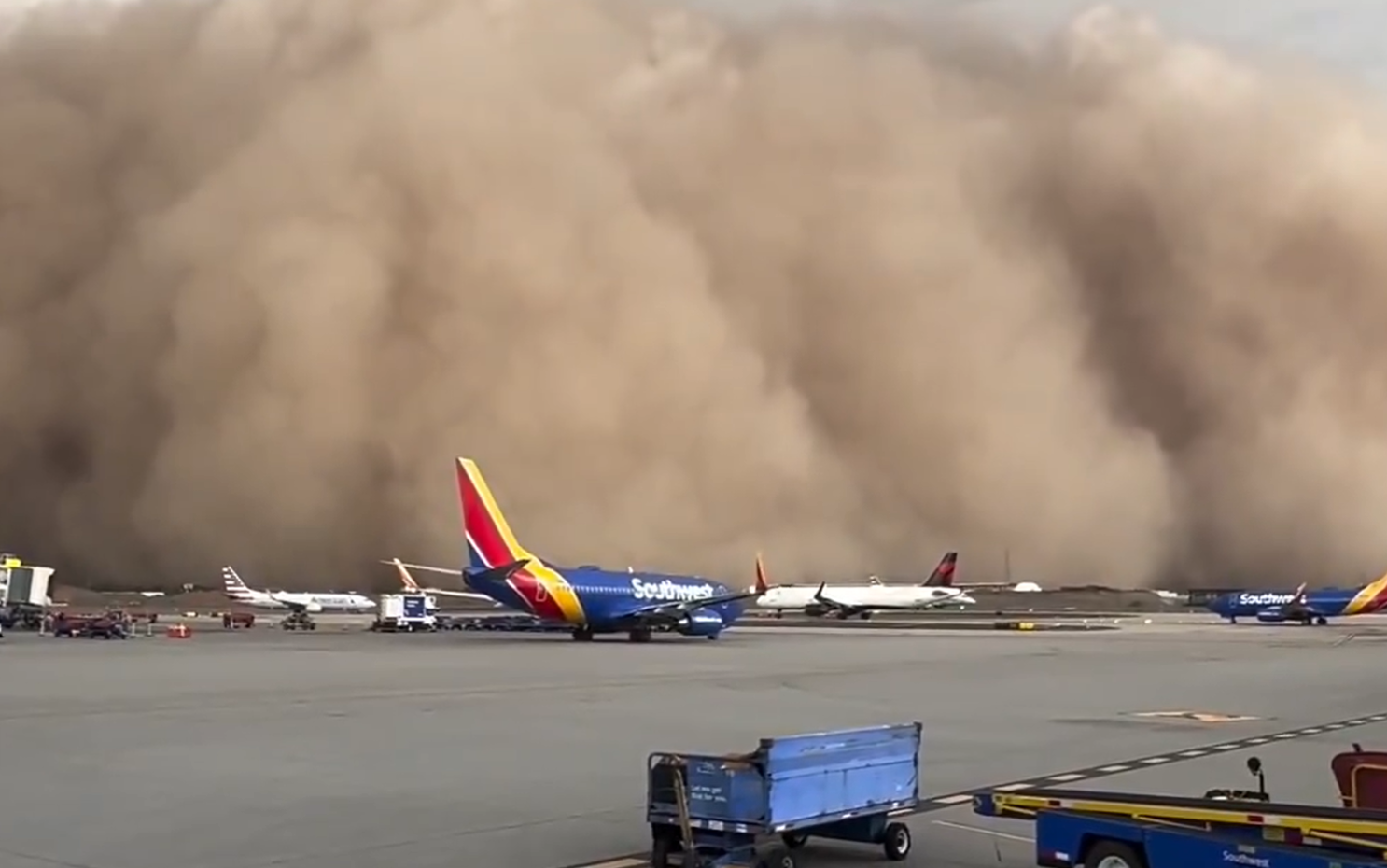 This evening: A massive dust storm is sweeping across Phoenix, creating an intense scene visible from Sky Harbor International Airport.