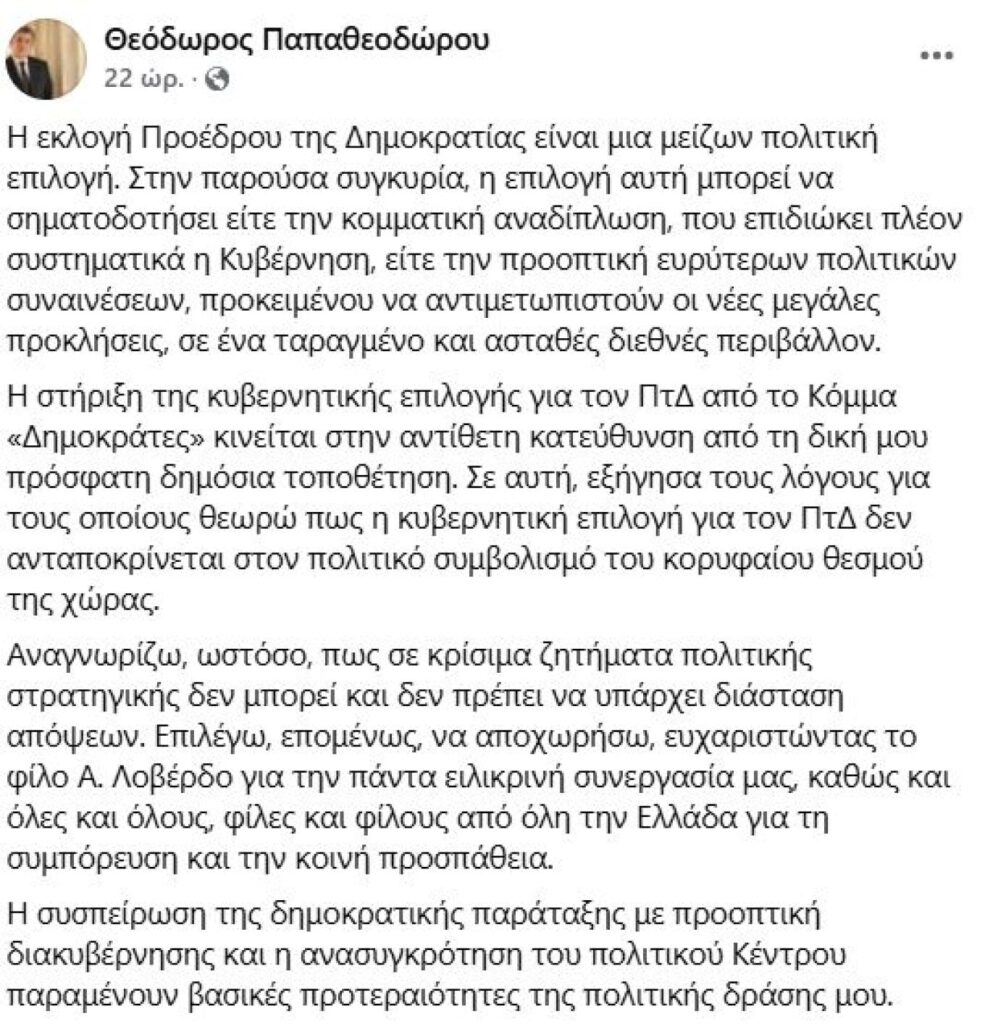 Την αποχώρησή του από τους Δημοκράτες, το κόμμα του Ανδρέα Λοβέρδου, ανακοίνωσε ο Θεόδωρος Παπαθεοδώρου, δηλώνοντας με αυτό τον τρόπο τη διαφωνία του με την στήριξη της υποψηφιότητας του Κώστα Τασούλα για την Προεδρία της Δημοκρατίας.