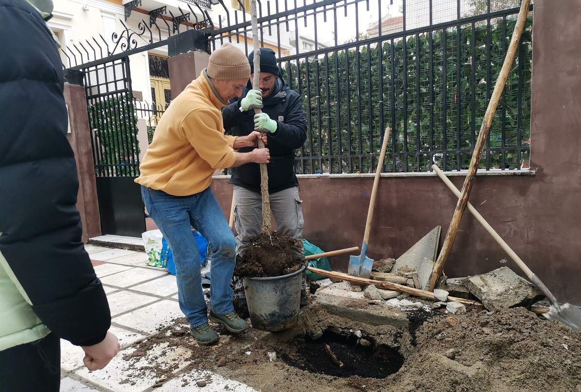 Πρόκειται για μια πρωτοβουλία του σχολείου σε συνεργασία με την περιβαλλοντική οργάνωση Μαμαγαία που αποφάσισαν να αποκαταστήσουν και να ομορφύνουν το δημόσιο χώρο φυτεύοντας ένα νέο δέντρο.