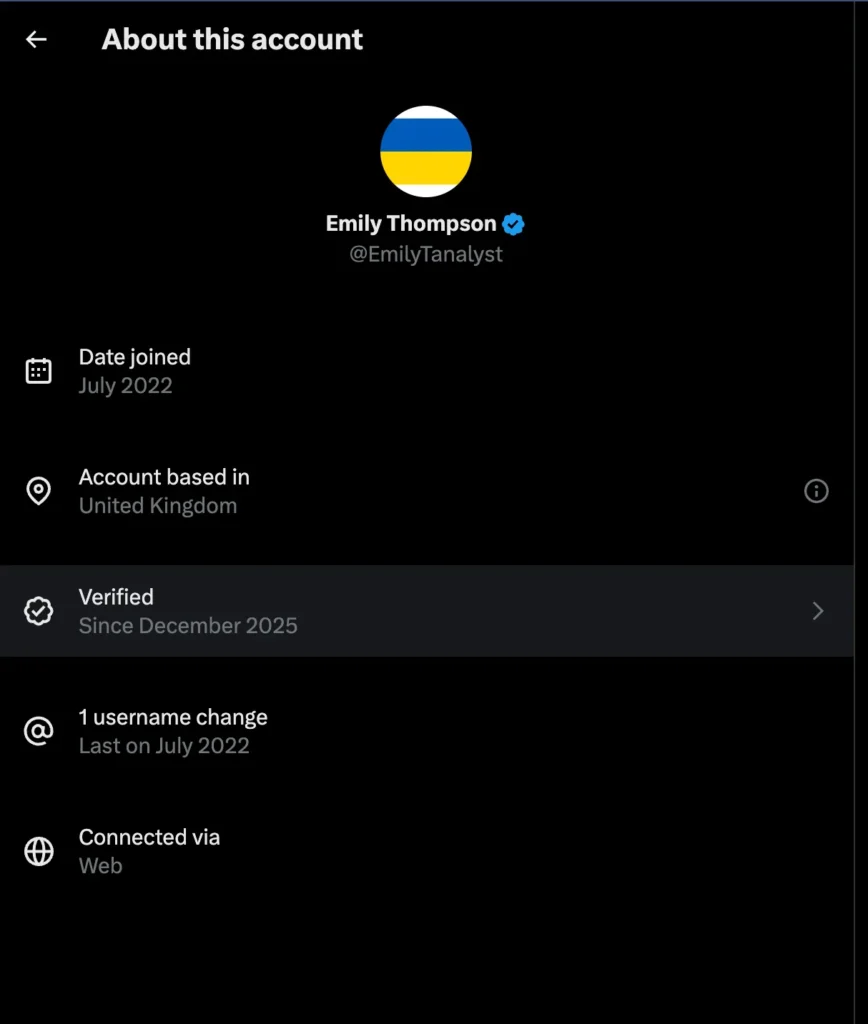 Σε ό,τι αφορά την προέλευση της ανάρτησης, βάσει των διαθέσιμων πληροφοριών στην πλατφόρμα Χ, ο λογαριασμός «Emily Thompson» είναι ενεργός από το 2022 και δηλώνει έδρα στο Ηνωμένο Βασίλειο. Ωστόσο, δεν κατέστη δυνατό να εντοπιστούν δημόσια ή επαληθεύσιμα στοιχεία που να επιβεβαιώνουν την πραγματική ταυτότητα του προσώπου ή των προσώπων πίσω από τον συγκεκριμένο λογαριασμό.