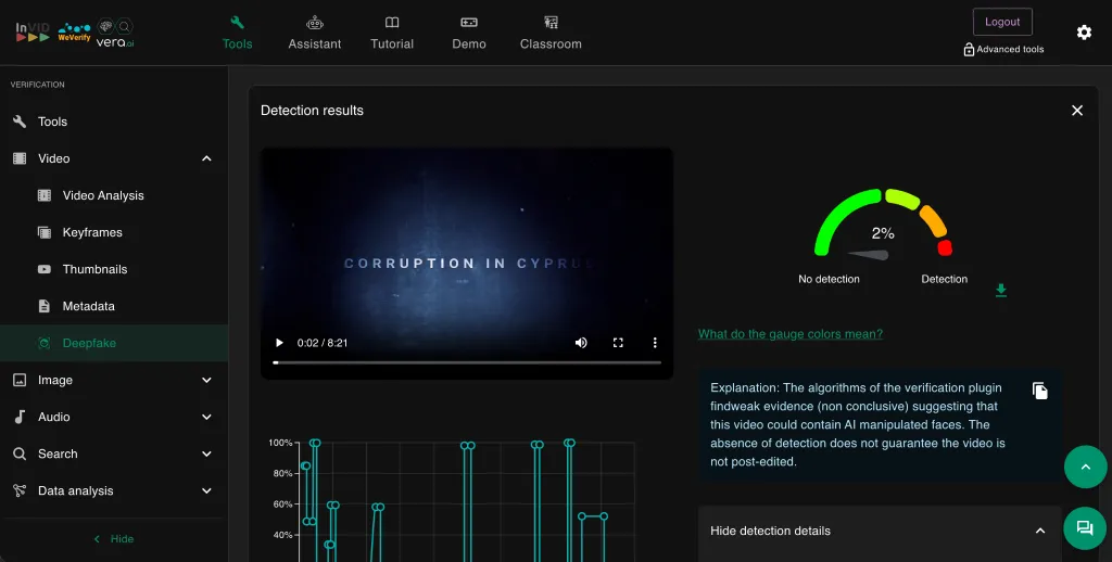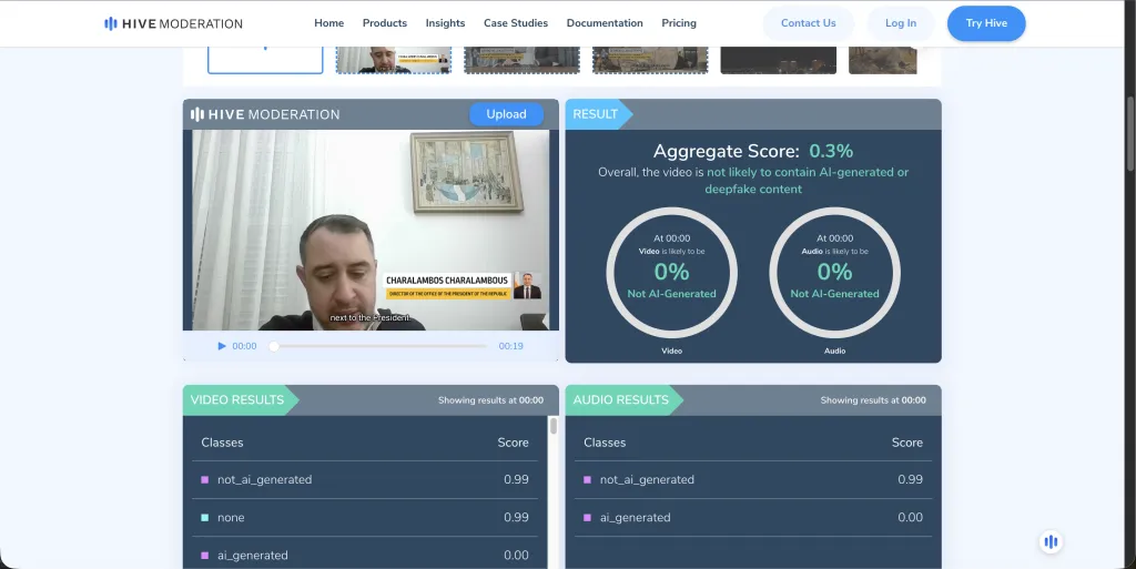 Σύμφωνα με το Fact Check Cyprus, η αντίστροφη αναζήτηση του βίντεο δεν απέδωσε αποτελέσματα, γεγονός που καθιστά αδύνατη την ταυτοποίηση της αρχικής του πηγής. Παράλληλα, το ίδιο το βίντεο, καθώς και επιμέρους αποσπάσματα στα οποία εμφανίζονται πολιτικά και οικονομικά πρόσωπα, εξετάστηκαν με εργαλεία ανίχνευσης τεχνητής νοημοσύνης και deepfake, συγκεκριμένα μέσω των πλατφορμών Hive Moderation και InVID-WeVerify.