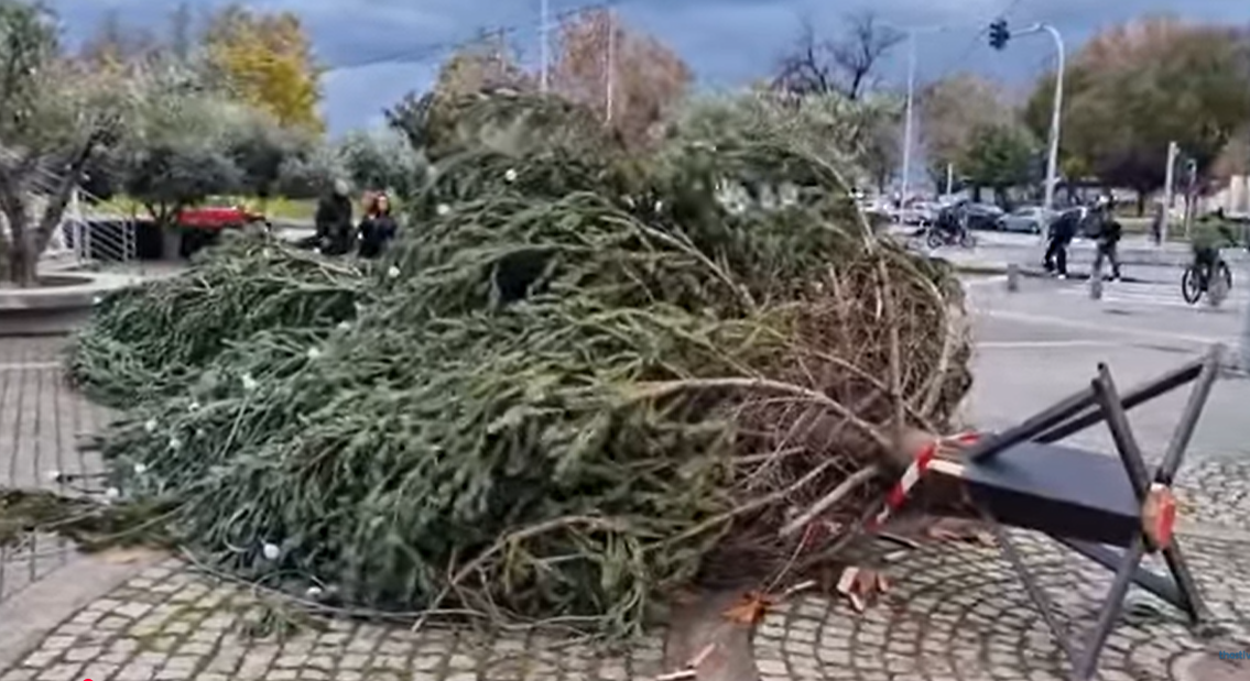 Το χριστουγεννιάτικο δέντρο στο Δημαρχείο Θεσσαλονίκης δεν άντεξε τις ριπές ανέμου (Βίντεο)