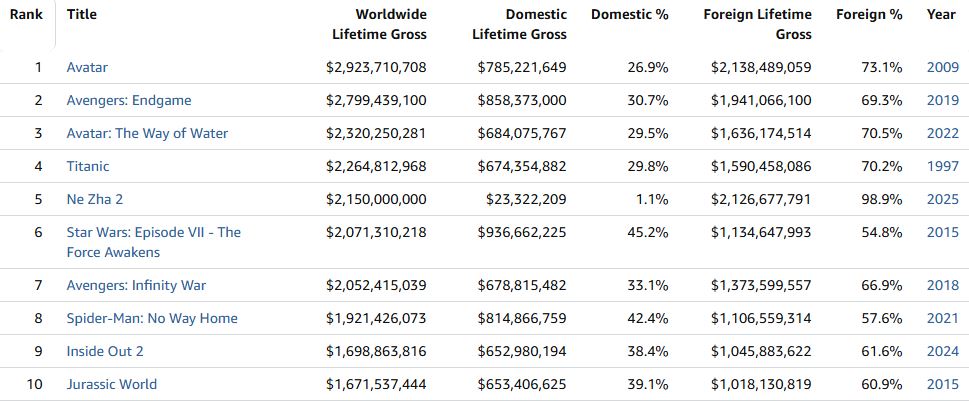 Το Top 10 των παγκόσμιων εμπορικών επιτυχιών (πηγή: boxofficemojo.com):