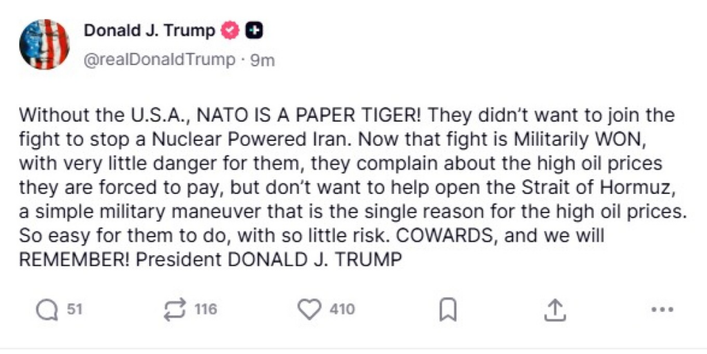 Τώρα που η μάχη κερδήθηκε στρατιωτικά, με πολύ μικρό κίνδυνο για αυτούς, παραπονιούνται για τις υψηλές τιμές του πετρελαίου που αναγκάζονται να πληρώσουν, αλλά δεν θέλουν να βοηθήσουν στο άνοιγμα του Στενού του Ορμούζ, έναν απλό στρατιωτικό ελιγμό που είναι ο μοναδικός λόγος για τις υψηλές τιμές του πετρελαίου».