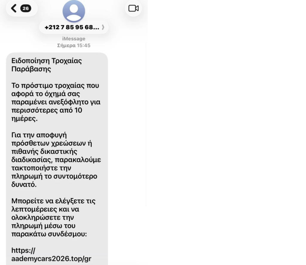 Αυτήν τη φορά, δεκάδες πολίτες έλαβαν στα τηλέφωνά τους SMS από άγνωστο πάροχο προσποιούμενο ότι έχει αποσταλεί από την Τροχαία για παραβάσεις, οι οποίες πρέπει να πληρωθούν το συντομότερο.