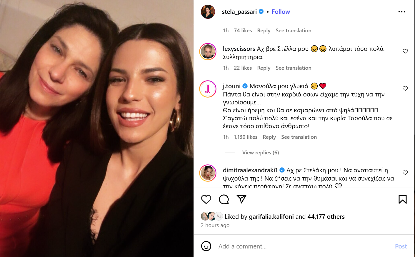 Τη δυσάρεστη είδηση έκανε γνωστή η ίδια η Στέλλα Πάσσαρη, η οποία δημοσίευσε μια φωτογραφία με τη μητέρα της την οποία συνόδευσε με ένα μακροσκελές και συγκινητικό κείμενο.