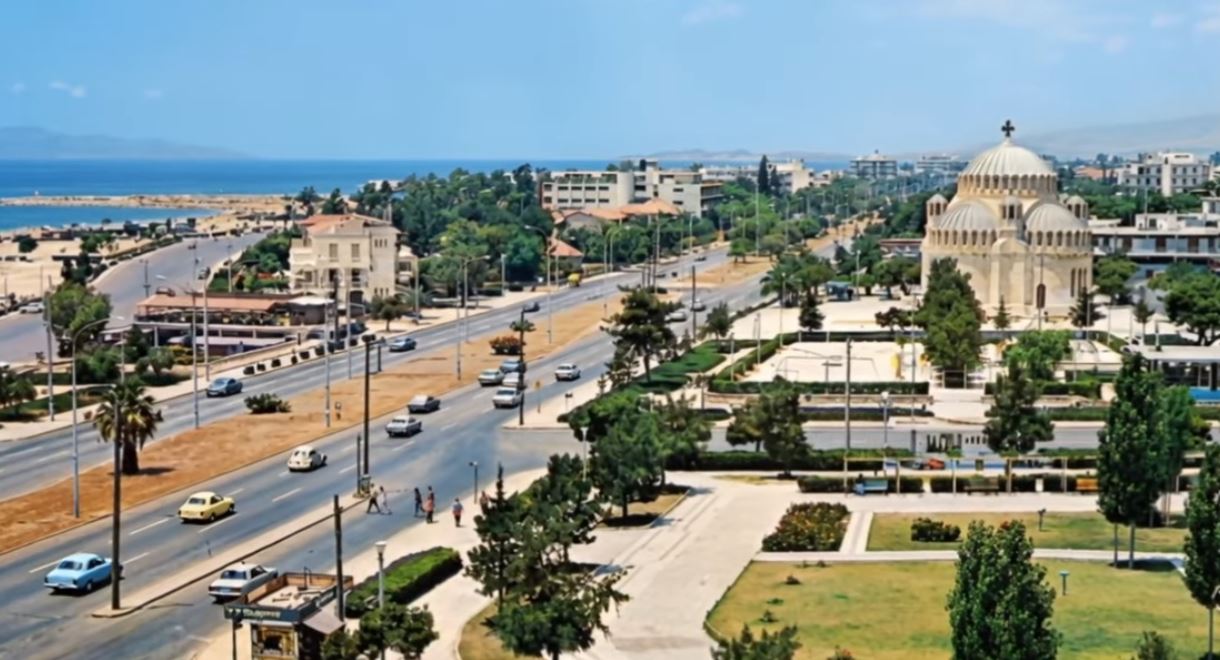 Δείτε την Παραλιακή λεωφόρο πιο άδεια από ποτέ, τον εμβληματικό ναό των Αγίων Κωνσταντίνου και Ελένης να δεσπόζει στο τοπίο, και την αίσθηση μιας γειτονιάς που συνδύαζε την πολυτέλεια με την απλότητα.