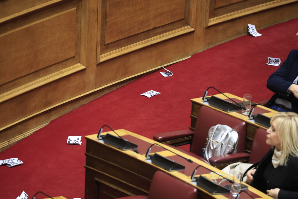Βουλή: Πέταξαν τρικάκια και φώναξαν συνθήματα κατά του Κυριάκου Μητσοτάκη από τα θεωρεία (Φωτό & Βίντεο)