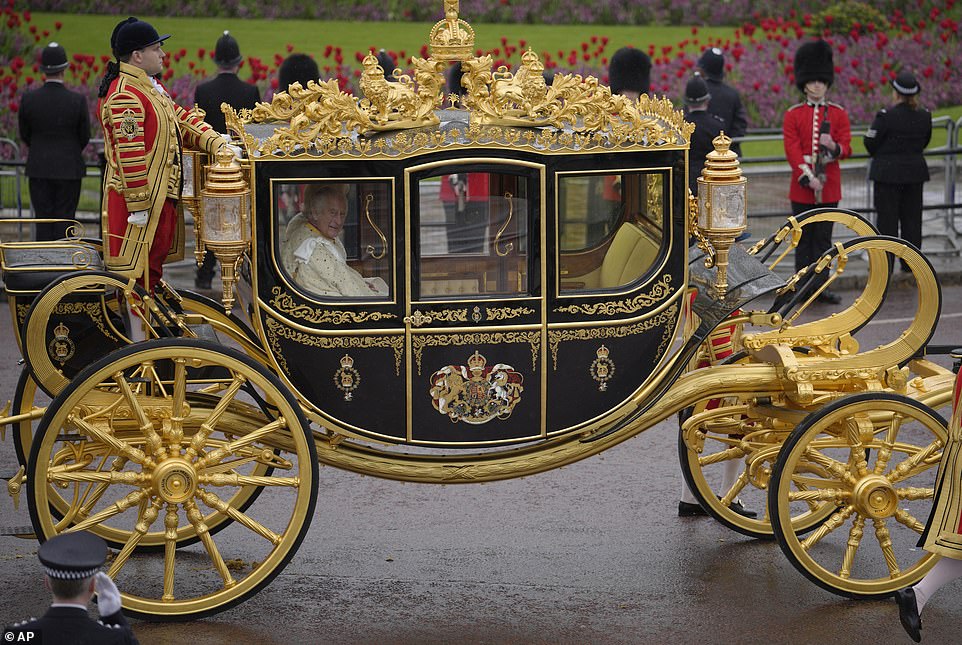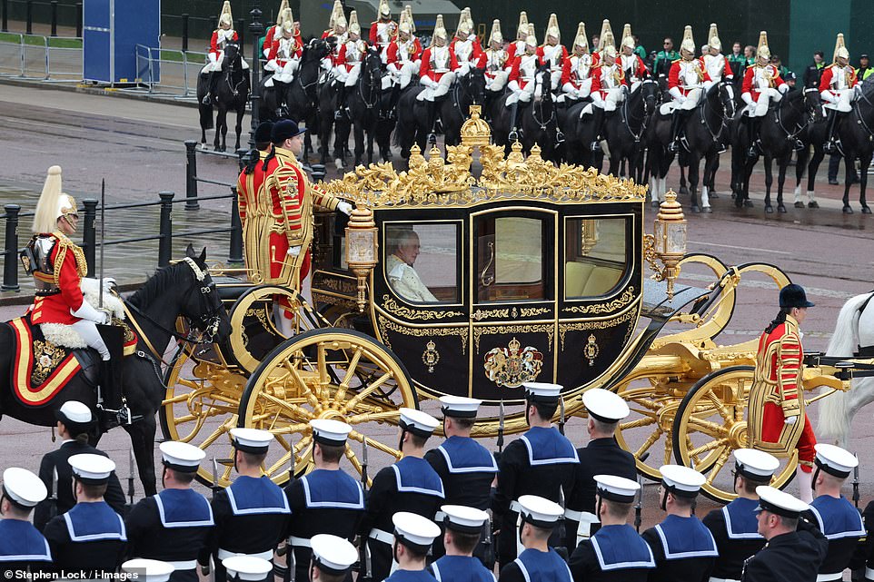 Στο παλάτι του Μπάκιγχαμ επιστρέφουν μετά τη στέψη τους ο βασιλιάς Κάρολος με τη βασίλισσα Καμίλα. Το βασιλικό ζεύγος επιβαίνει στη Χρυσή Άμαξα, ενώ συνοδεύονται και από άλλα μέλη της βασιλικής οικογένειας.