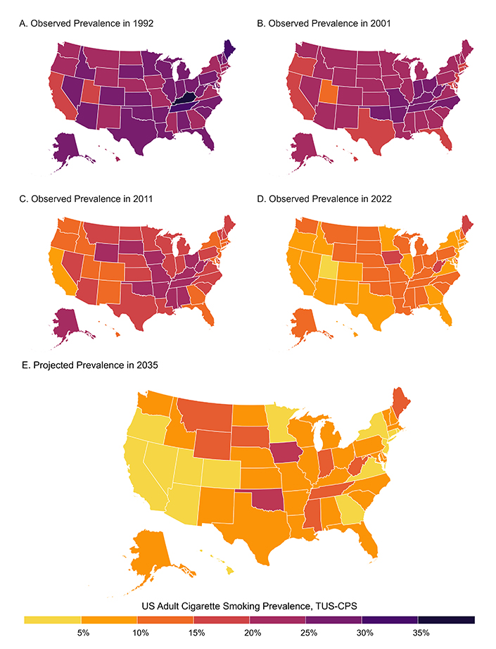 Από τη δεκαετία του 1950, όταν οι ερευνητές συνέδεσαν για πρώτη φορά το κάπνισμα με τον καρκίνο του πνεύμονα, τα εθνικά ποσοστά καπνίσματος έχουν μειωθεί δραματικά. Το 1955, το 56,9% των ενηλίκων των ΗΠΑ κάπνιζε. Μέχρι την αλλαγή του αιώνα, το ποσοστό αυτό είχε μειωθεί περισσότερο από το μισό και μέχρι το 2022 είχε μειωθεί και πάλι κατά 50%. Η τάση αυτή αναμένεται να συνεχιστεί, με τα ποσοστά καπνίσματος να προβλέπεται να μειωθούν και πάλι στο μισό μέχρι το 2035. Πρόσφατα στοιχεία δείχνουν ότι οι πολιτείες που έχουν σημειώσει τη μεγαλύτερη πρόοδο στη μείωση του καπνίσματος έχουν επίσης δει τις μεγαλύτερες μειώσεις στη θνησιμότητα από καρκίνο του πνεύμονα-συνήθως με καθυστέρηση 16 ετών.