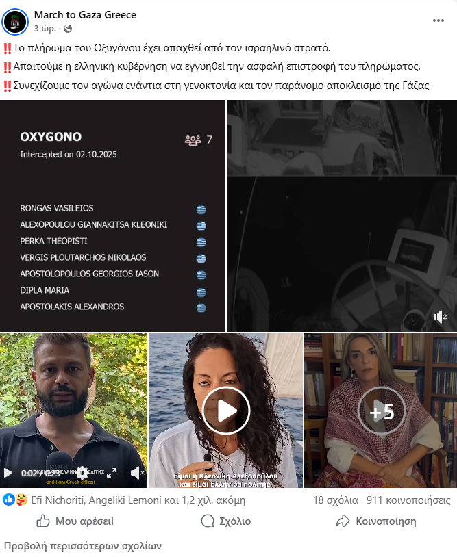 Η διεθνής αποστολή Global Sumud Flotilla, που είχε στόχο να σπάσει τον αποκλεισμό της Γάζας και να μεταφέρει ανθρωπιστική βοήθεια στους Παλαιστίνιους, βρέθηκε ξανά στο στόχαστρο των ισραηλινών αρχών. Μεταξύ των σκαφών που συμμετείχαν ήταν και το ελληνικό πλοίο «Οξυγόνο», το οποίο αναχαιτίστηκε το πρωί της Πέμπτης (2/10) από ισραηλινές δυνάμεις σε διεθνή ύδατα.