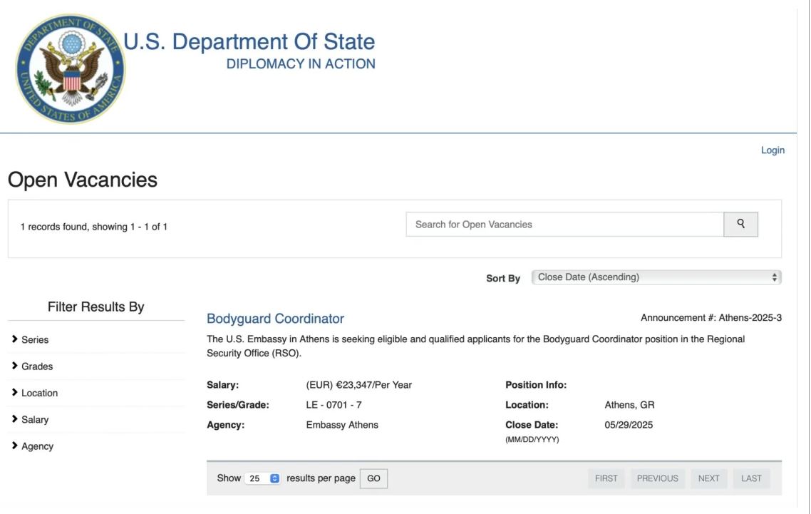 «Η Πρεσβεία των ΗΠΑ στην Αθήνα αναζητά κατάλληλους και καταρτισμένους υποψηφίους για τη θέση Συντονιστή Σωματοφυλάκων στο Περιφερειακό Γραφείο Ασφάλειας (RSO)», τονίζεται στην περιγραφή της αγγελίας.