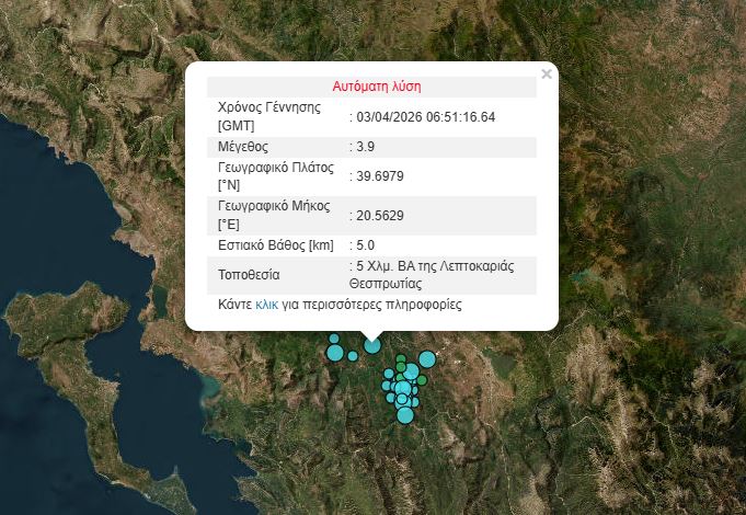 Σεισμός 3,9 Ρίχτερ στη Λεπτοκαρυά Θεσπρωτίας