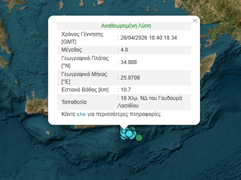 Νέος σεισμός 4 Ρίχτερ στα ανοιχτά του Λασιθίου