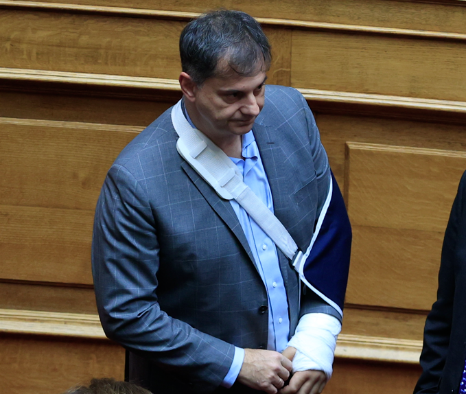 Χάρης Θεοχάρης: Με νάρθηκα στο χέρι εμφανίστηκε στη Βουλή – Το ατύχημα στο χιονισμένο Νταβός (φωτό)