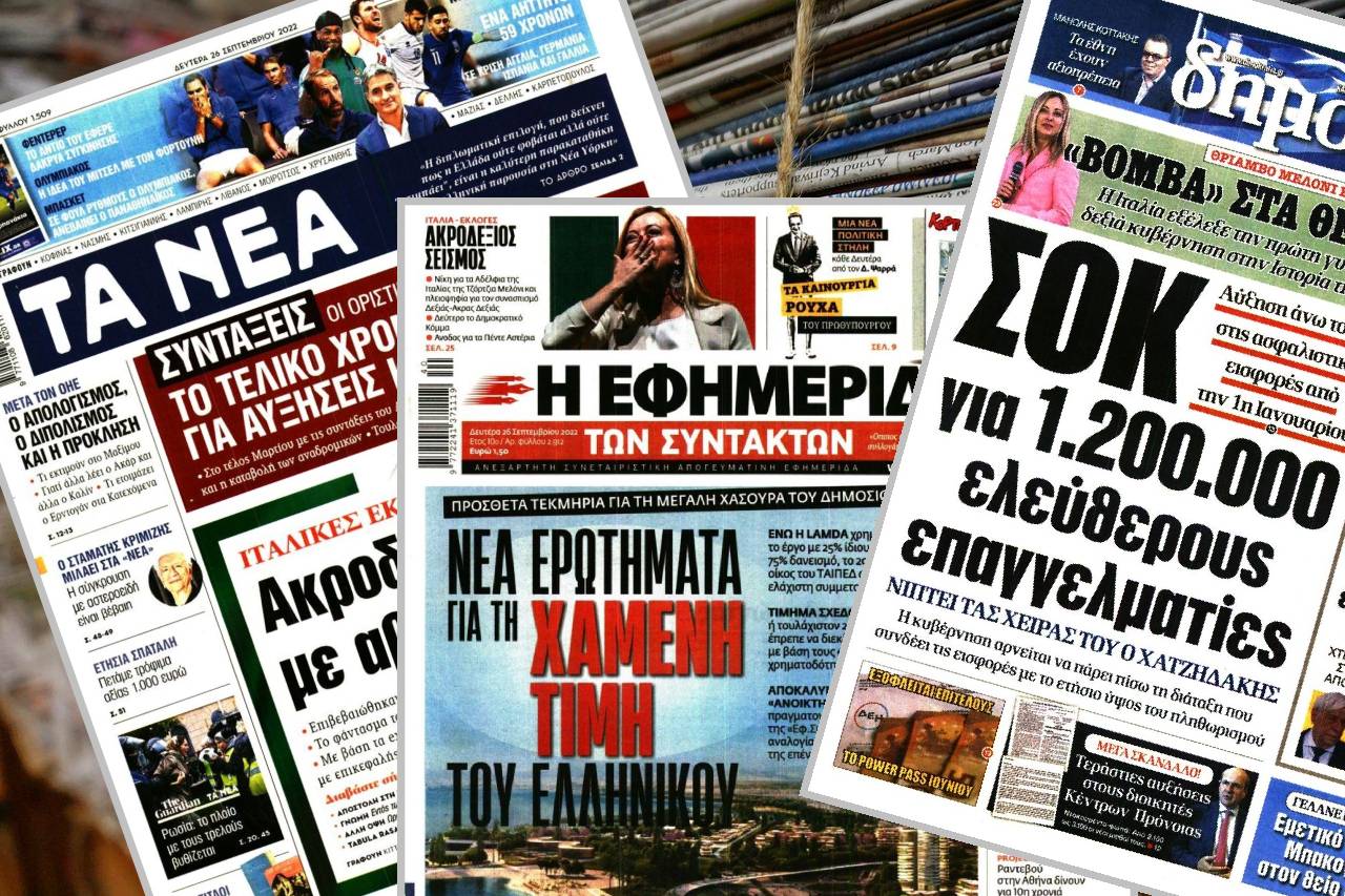 Διαβάστε τα πρωτοσέλιδα των εφημερίδων της Δευτέρας 26 Σεπτεμβρίου