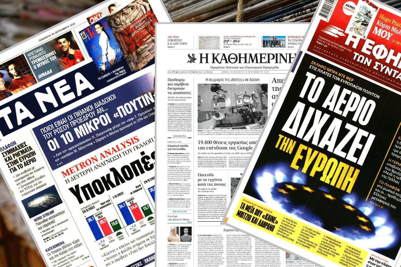 Διαβάστε τα πρωτοσέλιδα των εφημερίδων της Παρασκευής 30 Σεπτεμβρίου