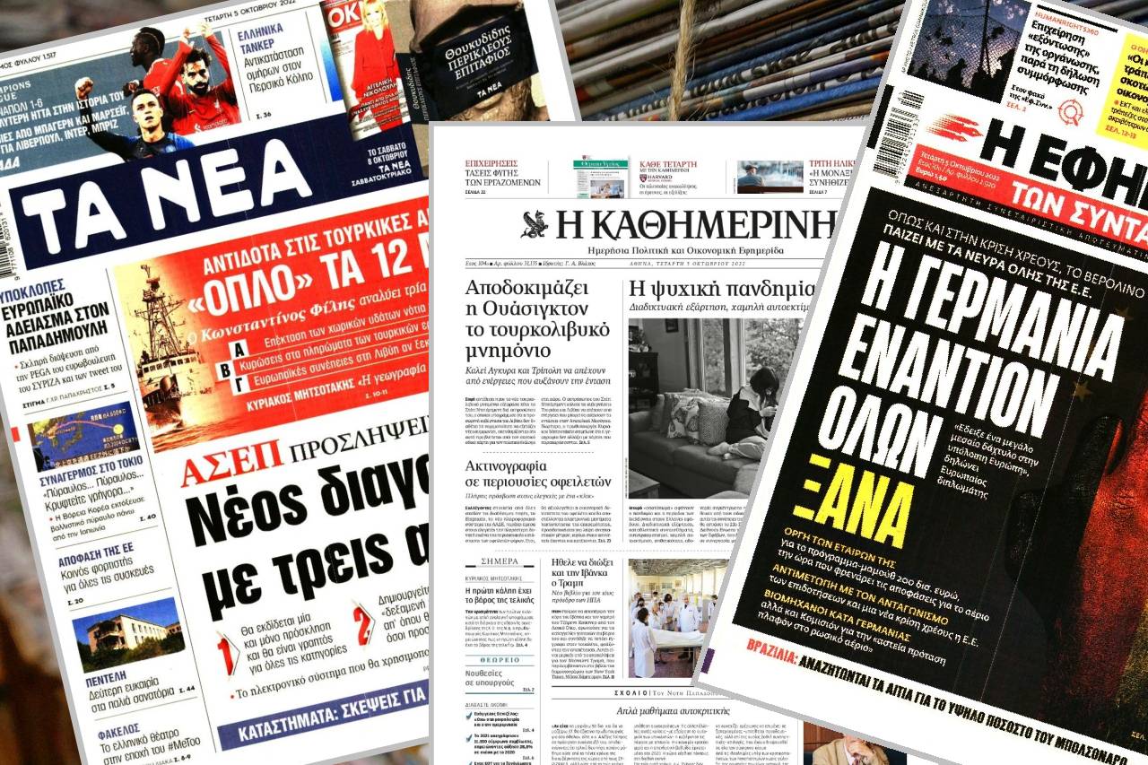 Διαβάστε τα πρωτοσέλιδα των εφημερίδων της Τετάρτης 5 Οκτωβρίου