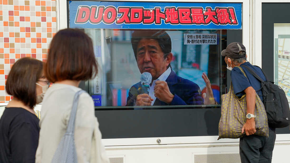 Πολυάριθμοι απλοί πολίτες περίμεναν στην ουρά για να αποθέσουν μπουκέτα με λουλούδια και να σταθούν για λίγη ώρα μπροστά σε πορτρέτο του Άμπε εγκατεστημένο σε σκηνή κοντά στο Νιπόν Μπουντόκαν